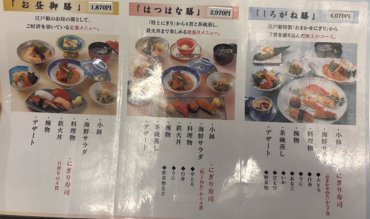 大とろやうにを含む江戸銀特製の「おまかせにぎり」を筆頭に、海鮮サラダ、椀物、茶碗蒸しなど、全7品の豪華絢爛なラインナップ。贅沢なランチタイムをご堪能いただけます。