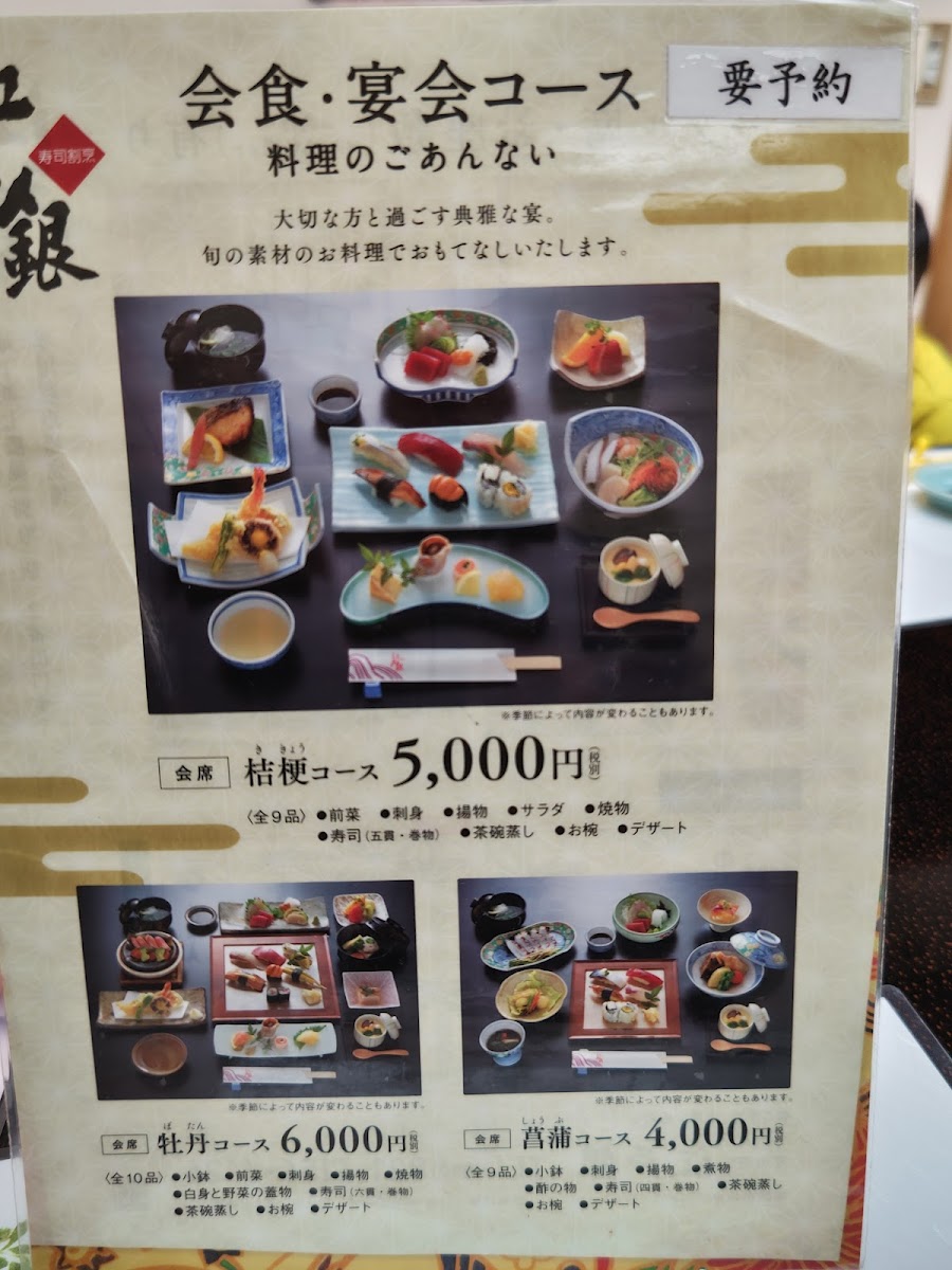 四季折々の旬の味覚をご堪能いただけるコースです。お刺身に揚げ物、江戸銀自慢の寿司など、職人が腕によりをかけた品々をお楽しみください。各種ご宴会や接待などにオススメです。