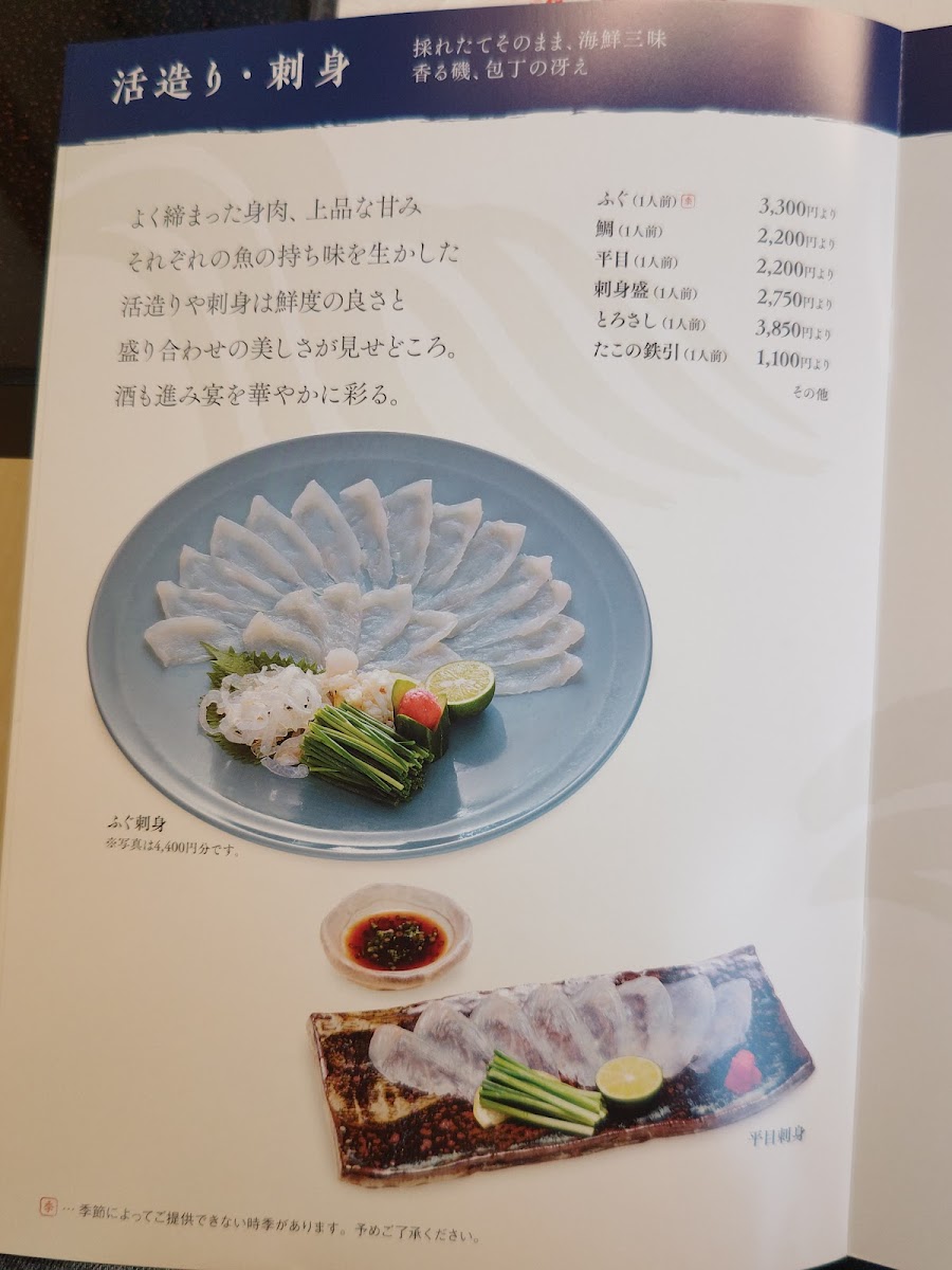 For those looking for an indulgent and luxurious experience, the Fugu Kaiseki (ふぐ会席) is a standout choice. Priced at 11,000 yen (tax included), this set includes nine dishes that revolve around fugu (pufferfish), with highlights such as fugu sashimi, shirako yaki (grilled fish milt), fugu karaage (fried fugu), and a warming fugu chiri nabe (fugu hot pot), accompanied by three pieces of sushi. This menu is perfect for a special occasion or when you want to try the delicacies of one of Japan's most famous fish in a variety of preparations.